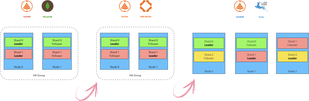 对于节点失效,涉及到判活和后续的数据处理两类的问题。对于很多系统而言,冗余和分片是分开的,比如 Redis Cluster、MongoDB、AnalyticDB Worker,即有一个 HA Group 的概念,HA Group 中的每一个节点,数据是完全一致的。不同系统处理的时候依然会有些区别,一些系统 HA Group 中的某一个节点所有分区都是 Leader,我们称为 Leader 节点,提供读写服务,其它节点只有冗余数据的同步流量,称为 Follower 节点,比如 Redis Cluster,这类系统在调度系统不够成熟的时期,有一个明显的短板就是 Follower 节点所在的机器资源是有空余的,通常是通过朴素的混布来提供资源的利用率,但也带来了部署上的复杂度,所以在系统设计的时候就会有这样的考量:能不能在 HA Group内分散这些分区的 Leader 呢,于是就有了下面这些系统。一些系统 HA Group 的每一个节点都承担部分分区的 Leader,这就是每个节点都会提供读写服务,比如 AnalyticDB Worker。这类有 HA Group 的系统,判活和后续数据处理一般只在 HA Group 内,即某个节点失效后,会把访问流量转移到 HA Group 内的其它节点,然后通过上层的调度在 HA Group 内补充新的节点。还是老问题,在调度系统还不够成熟的时期,补充新的节点也会带来运维的复杂度,那就会有新的考量:能不能跨越 HA Group 的限制,把冗余的个数和系统内节点的个数解耦呢?于是就有了 Kudu 这类系统的架构,冗余和分片是交织起来的,某一个节点失效之后,它上面的分区会由中心节点来调度到其它节点。在调度能力非常成熟的今天,数据库系统自身的能力怎么和数据库相关的调度能力想结合,也会给系统架构带来新的启发。