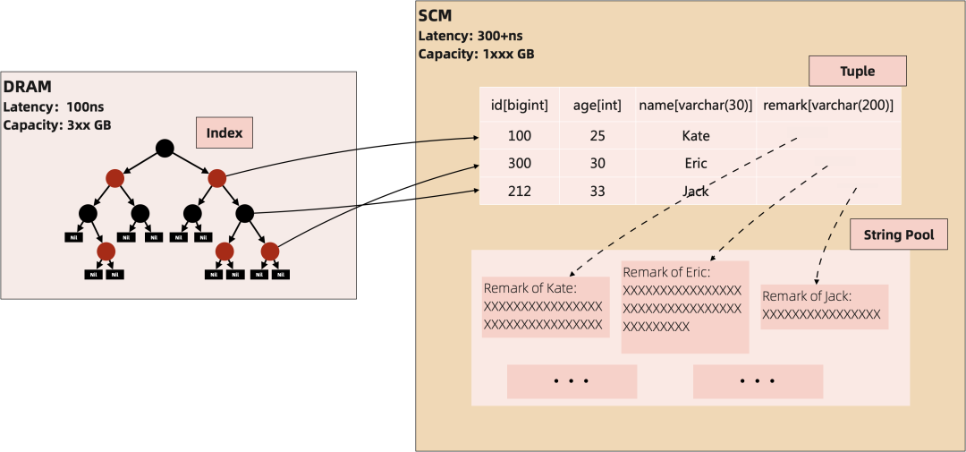 作为内存数据库,Tair 在绝大部分场景使用单次访问延时在 ns 级别的内存 / SCM 作为主要的存储介质。以 Table 存储为例,服务端的常驻数据大概可以分为 Tuple(可以认为是表里面的某一行)、String Pool、Index 三部分,这些数据都是存放在内存 / SCM 中,只有快照和日志会存放在磁盘上。