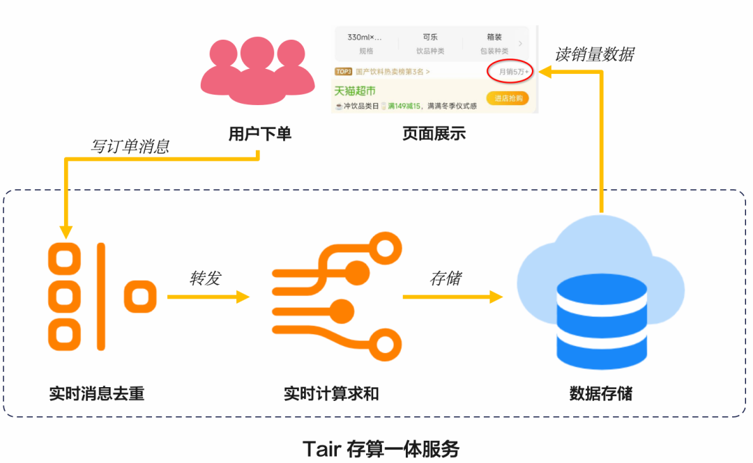 历史上双十一因无法解决销量的实时计算问题对商家产生过很多困扰。为应对2022年双十一,Tair 销量计数项目应运而生:利用已有的 Tair 非精确“去重计数”算子开发新的“去重求和”算子,解决用户商品销量计数慢而无法实时获得销量数据的痛点问题。通过对用户的商品订单消息进行原子地“去重和销量的实时求和”能力,双十一首次做到了“买家订单数不降级”、“商品月销量不降级”两项大促核心体验。同时,利用 Tair-PMem 底座进一步帮助用户降低使用成本,提升数据持久化能力。相比于传统的 AP 类数据库,通过开发的独特非精确计算算子,有效降低了单 QPS 的计算成本。