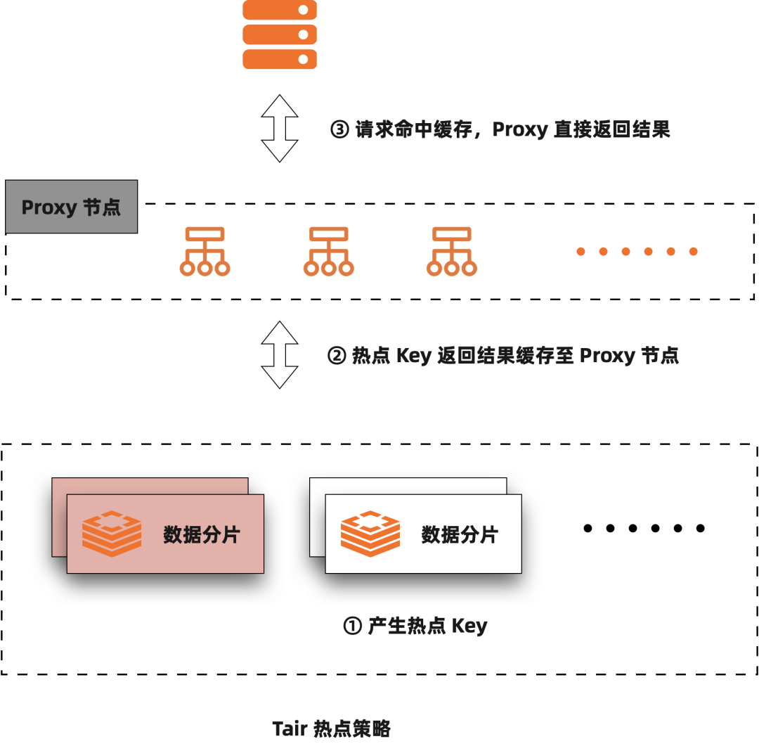 热点访问是商品维度、卖家维度的数据常常会遇到的一个挑战,热点方案也是 Tair 能够服务于低延时场景的关键能力。前面讲了水平扩展之后,用户的某个请求就会根据一定的规则(Hash、Range、List 等)路由到某一个分区上,如果存在热点访问,就会造成这一个分区的访问拥塞。处理热点有很多方案,比如二级散列,这种方案对于热点的读写可以做进一步拆分的场景是有用的,比如现在我们有一个卖家订单表,然后卖家 id 是分区列,则我们可以再以订单 id 做一次二级散列,解决一个大卖家导致的热点问题;目前淘宝大规模使用的 Tair 的 KV 引擎不满足使用二级散列的前提,一般来说商品的信息映射到 Tair 内就是某一个 Value,更新和读取都是原子的。所以 Tair 目前使用的方案是在一层进行散列,借助于和客户端的交互,将热点数据分散到集群当中的其它节点,共同来处理这个热点请求,当然这种方案需要应用接受热点在一定时间内的延迟更新。另外这种方案需要客户端和服务端协同,需要应用升级到对应的客户端才能使用。所以最新的 Tair 热点策略在兼容社区 Redis 的服务时使用了不同的方案,应用能够直接使用任一流行的开源客户端进行访问,因此需要在服务端提供独立的热点处理能力。目前的 Tair 热点能力是由 Proxy 来提供的,相对于 Tair 之前的方案,这种方案拥有更强大的弹性和更好的通用性。