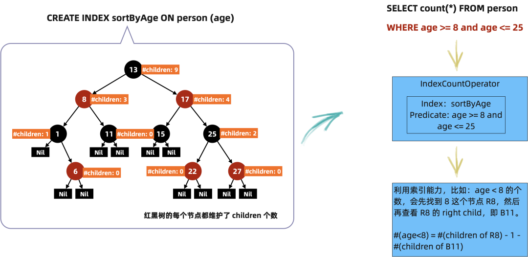 在数据库系统中,索引能力的增强还可以让执行器对外暴露更强的算子,比如 Tair 中的 RBTree 提供了快速计算两个值之间 Count 的能力,对外提供了