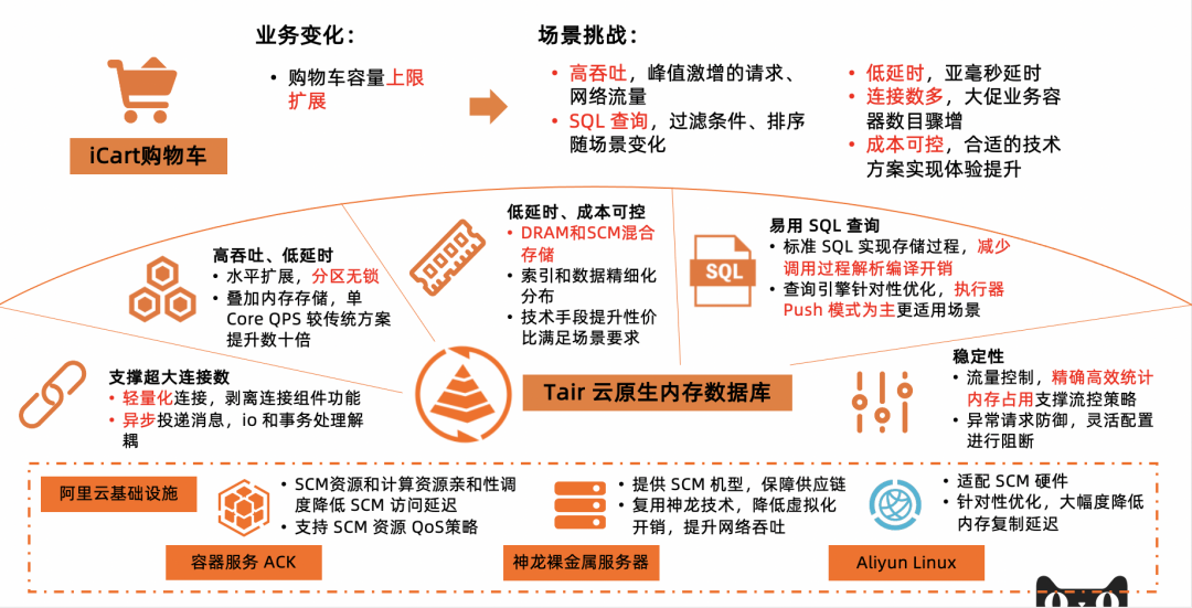 提到 MySQL,开发者很容易想到 Table 模型,想到 SQL 查询来进行过滤、排序、聚合等操作;想到 Redis,很容易想到高吞吐、低延时。使用 Redis 来进行读加速的场景,都需要把 MySQL 中数据查询出来之后,序列化到某一个 Value,加速场景直接获取 Value 即可,无需再进行过滤、排序等操作。如果一个读加速的场景不仅需要高吞吐低延时,也需要进行过滤等操作,Redis 还能够满足需求么?更进一步,如果引入读加速的过程中不希望改变数据模型,依然希望使用表模型,省去模型转换的心智负担,同时拥有高吞吐低延时,支撑 10w 级别的连接数,需要使用什么产品呢?目前优惠查询和购物车的场景的需求抽象出来就是这样,这种需要关系型数据库超级只读的场景就需要引入 Tair 的 SQL引擎,兼有 MySQL 和 Redis 优势的产品。