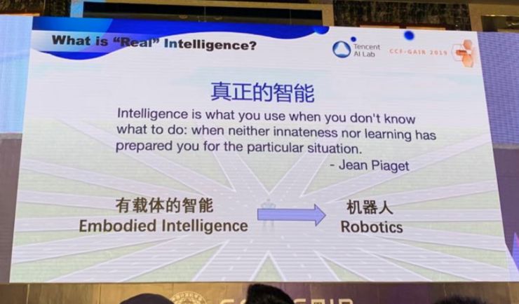 什么是真正的智能?我想目前还没有定论,而且我们对我们自己的智能还没有足够的了解。不过我很认同瑞士认知科学家 Jean Piaget 说的,智能是当你不知道如何做的时候你用的东西。我认为这个定义是非常有道理的。当你无法用你学到的东西或天赋去面对时,你动用的东西就是智能。如何去实现有智能的系统呢?可能有很多条路,但我认为一条很重要的路是需要把载体考虑进去,做有载体的智能,也就是机器人。