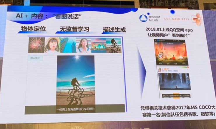 我们腾讯 AI Lab 在这方面也开始做了一点点工作。比如我们的看图说话项目能够用语言描述一张照片的内容,2018 年 1 月,我们上线 QQ 空间 app 让视障用户「看到」图片。