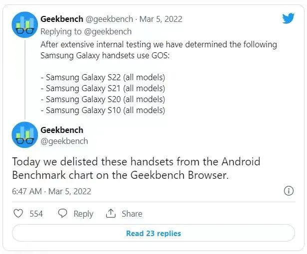 但知名跑分软件 Geekbench 对三星这一行为进行了指责,表示三星是在操纵基准测试,随后将三星过去四年的四代 S 系列旗舰从基准测试中除名。被除去的产品分别为:Galaxy S10 系列、S20 系列、S21 系列和刚刚发布不久的 S22 系列。