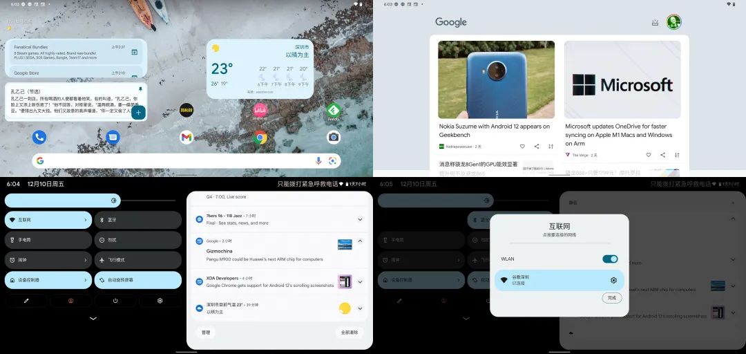 Android 12L 在 Android 12 的基础上,优化了通知、快捷设置、锁屏、概览、主屏幕等元素的显示,让它们在大屏设备上更美观易用。