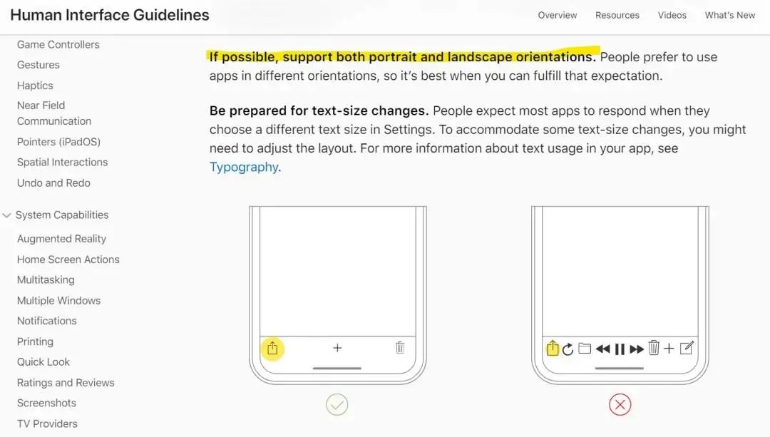 苹果开发者指南:“如果可能,同时支持纵向与横向”