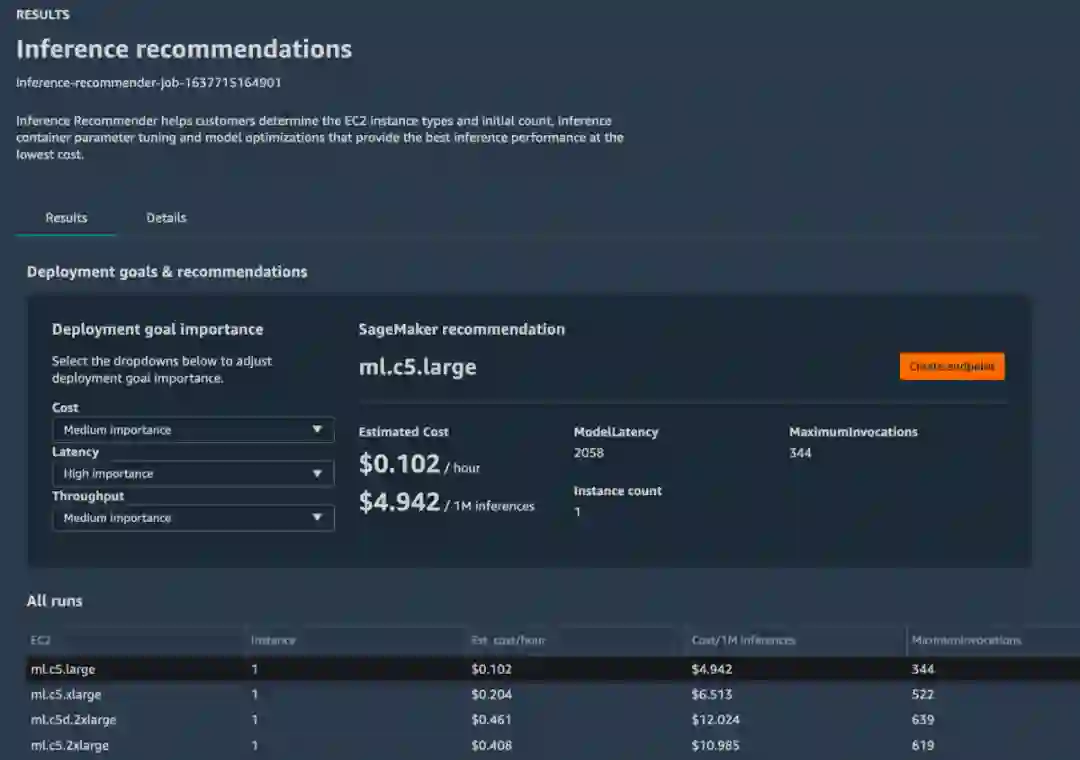 考虑到现实中,很多客户有专项需求,但很难判断多少计算资源合适,另一功能 Amazon SageMaker Inference Recommender 则提供推理阶段中的配置和实际运行参数推荐,在成本和速度之间找到最佳平衡点。