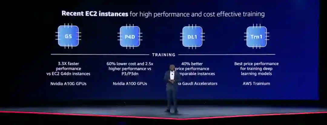 更有机器学习定制训练芯片 Trainium,支持 Trn1 实例,能够为用户在云中训练深度学习模型提供更高性价比和更快速度。