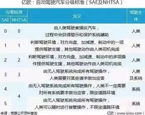 关于自动驾驶的分级,主要有SAE(美国机动车工程师学会)标准和NHTSA(国家公路交通安全管理局)两个标准;目前,前者受到大多数业内人士的认可,它从Lv0-Lv5将自动驾驶依据控制方式和适用环境分为了6个等级。