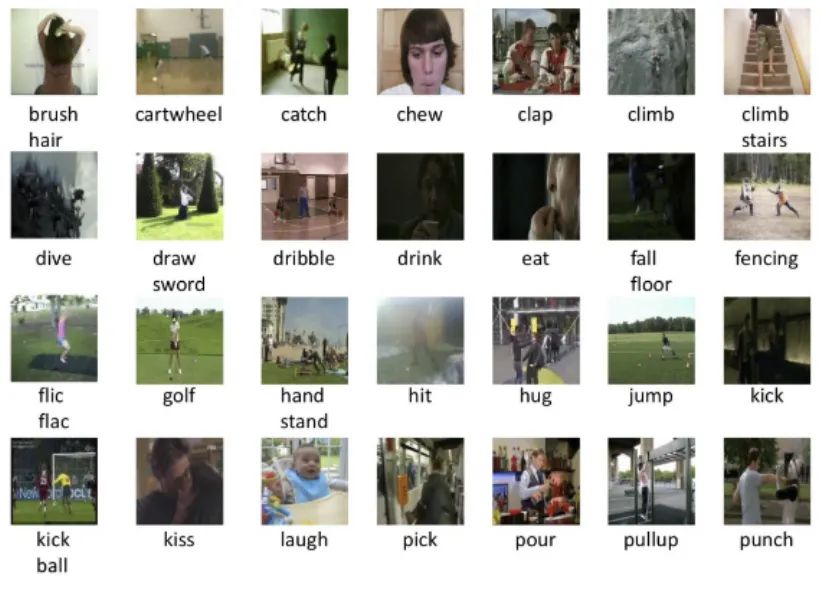 由布朗大学发布的人类动作视频数据集,该数据集视频多数来源于电影,还有一部分来自公共数据库以及YouTube等网络视频库。数据库包含有6849段样本,分为51类,每类至少包含有101段样本。