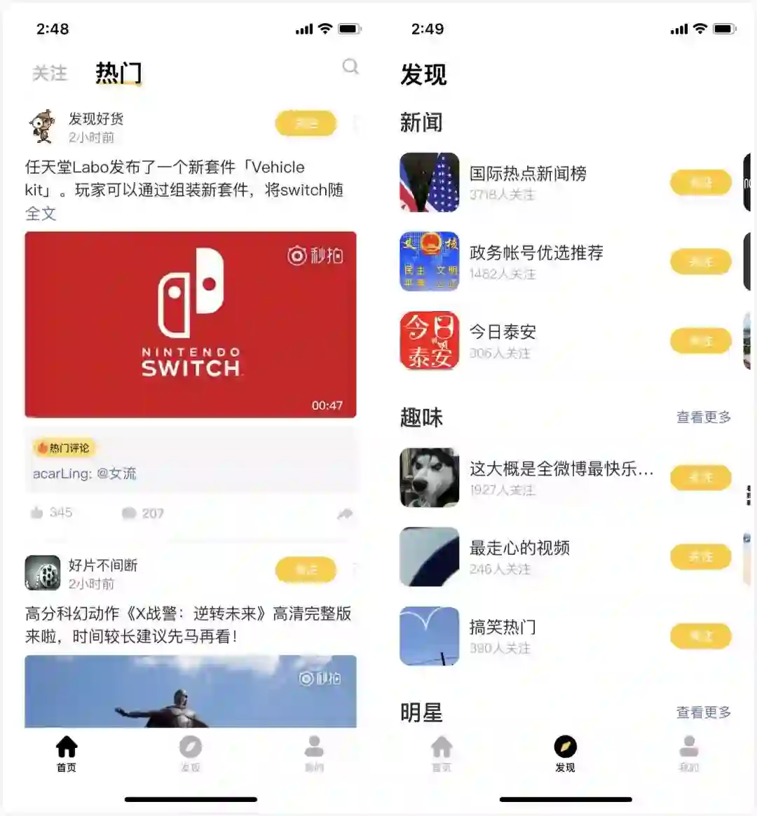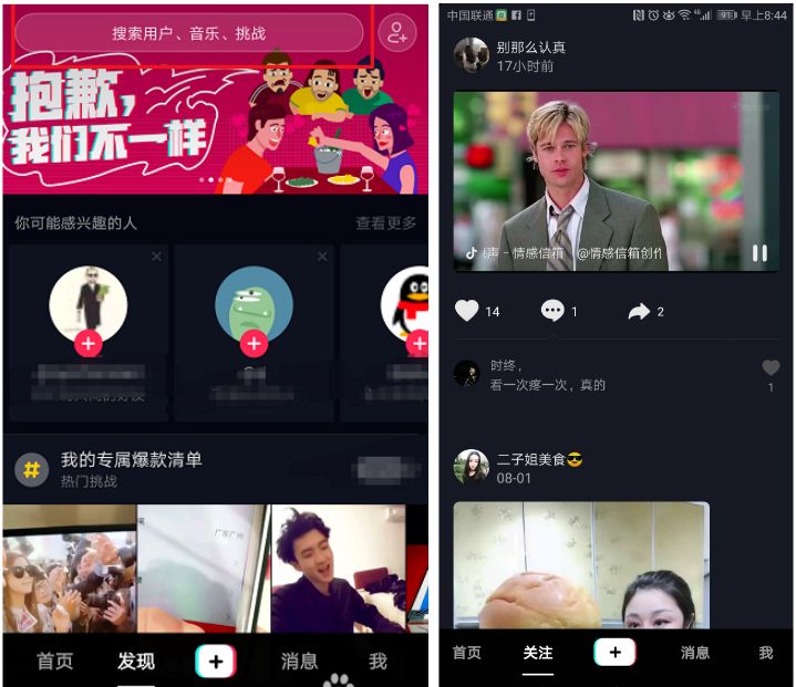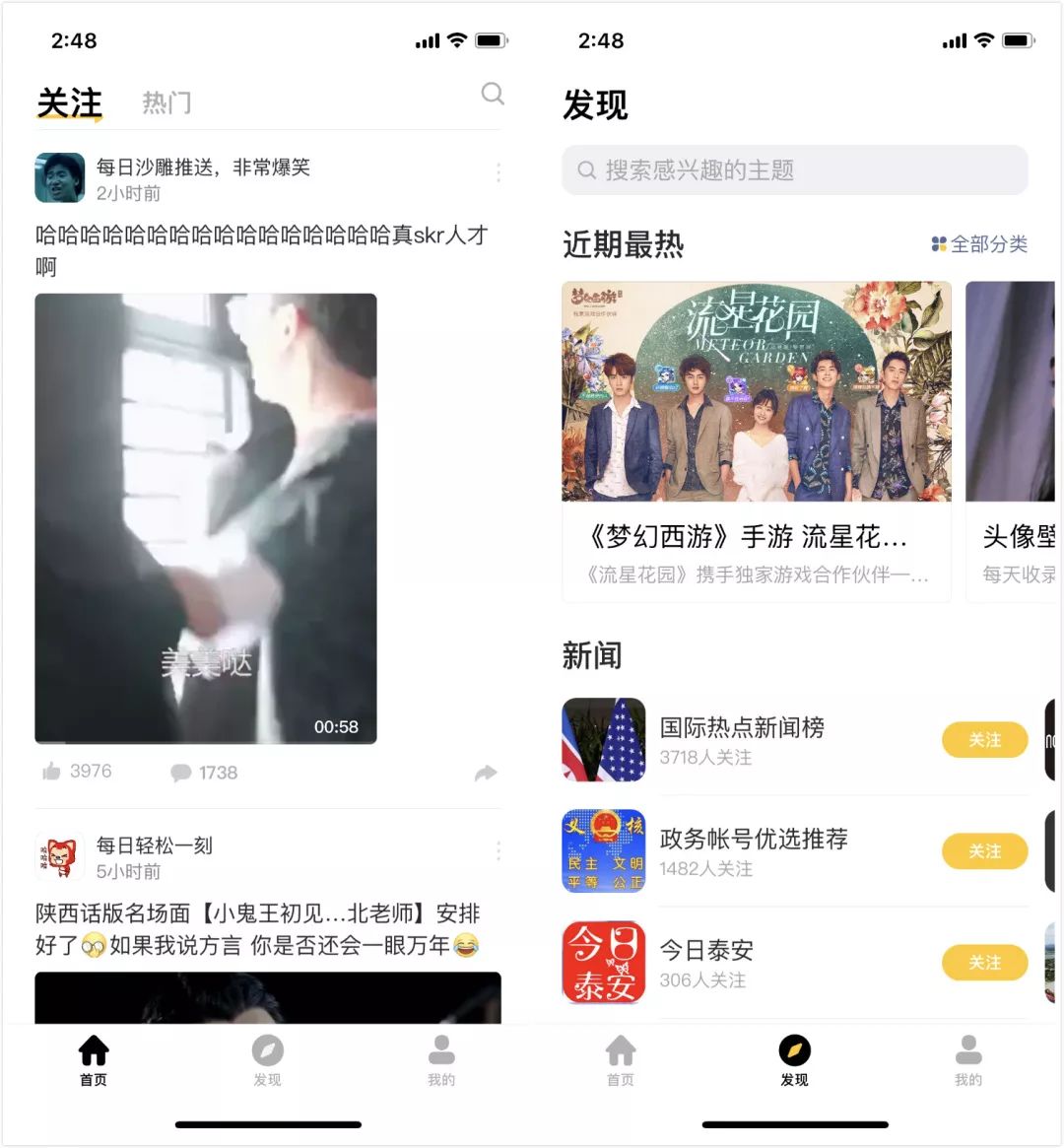 ——将原先的“发现”栏改为“关注”,且内容展现方式类似微博帐号。