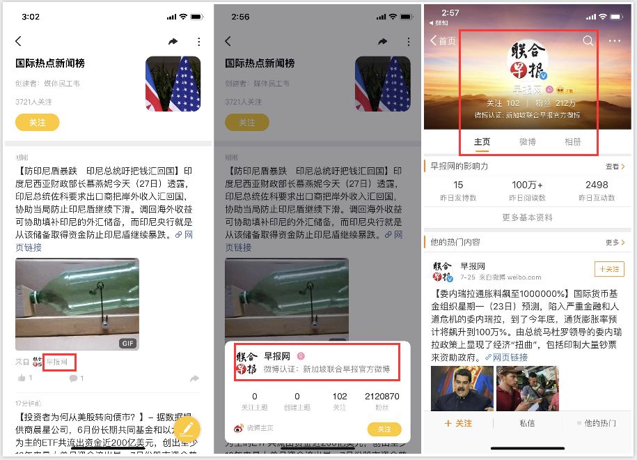 (左:鲜知App主题“国际热点新闻榜” 中:点击“早报网”跳出便签 右:跳转至“早报网”微博页)
