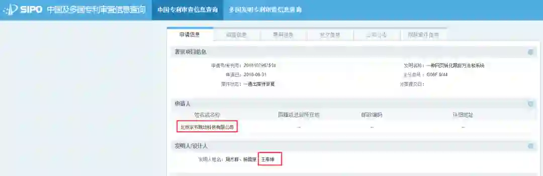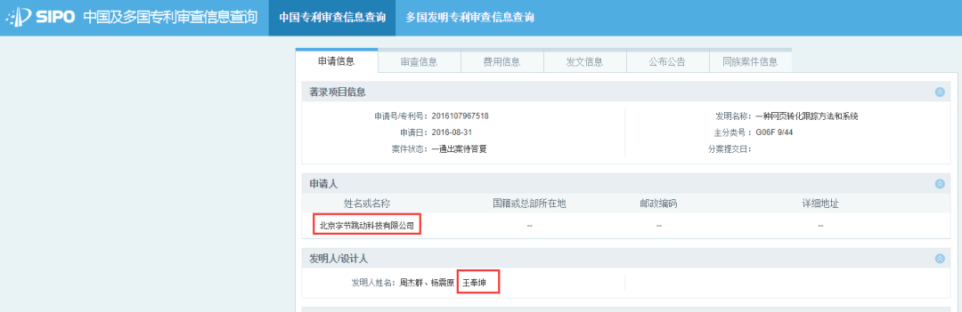 (字节跳动专利名单包含王奉坤 来源:SIPO中国及多国专利审查信息查询)