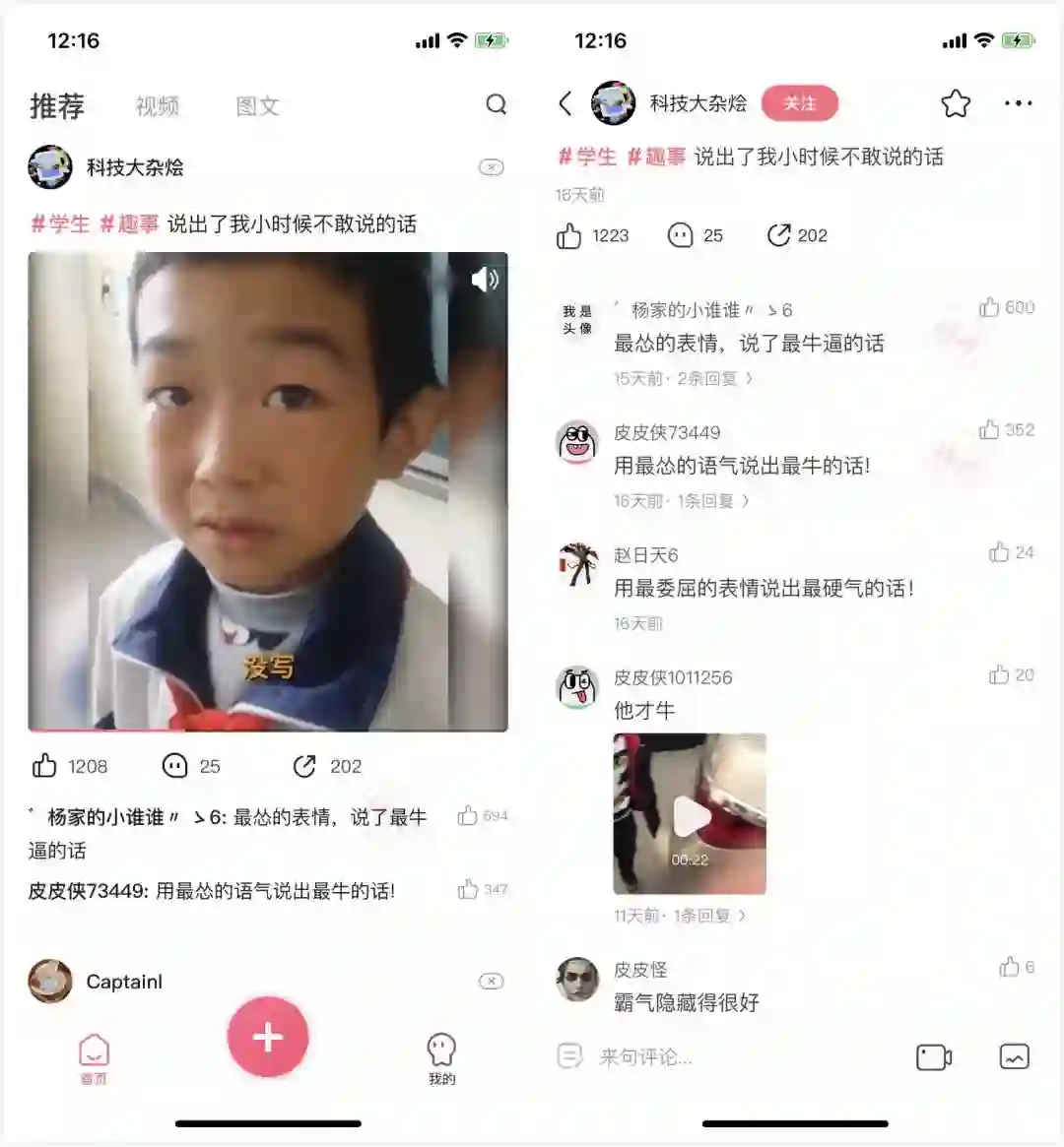 3、在内容话题构建上,皮皮虾依靠搞笑的视频和图文内容吸引用户;