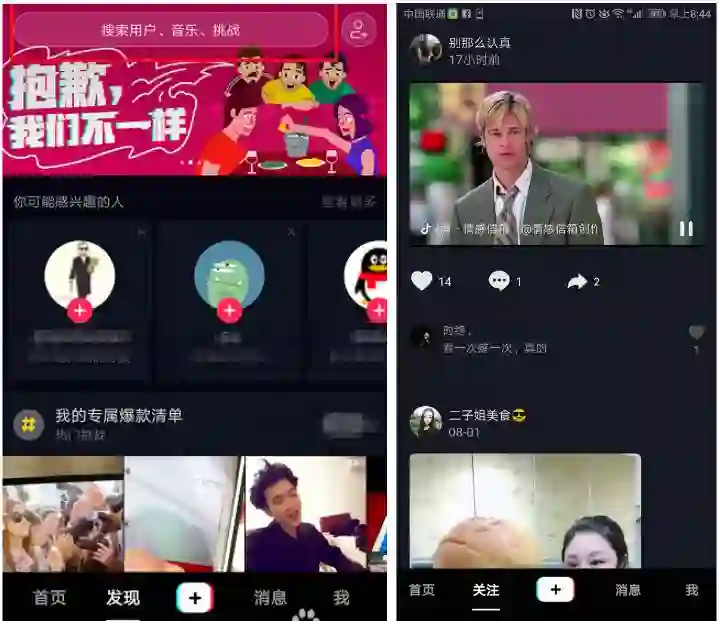 最右首页突出“关注”功能,更重视对用户关系链的构建。