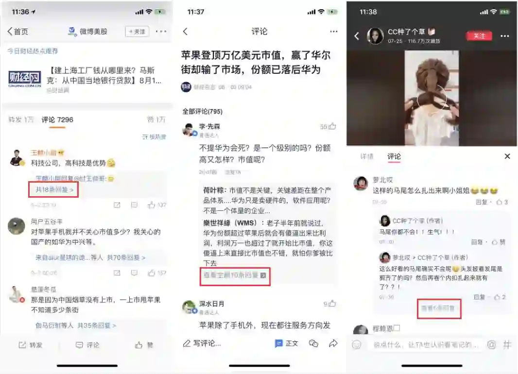 与树形分支相反,线形分支不会折叠回复内容,而是按照回复内容的时间线显示,并通过算法推荐的方式将优质评论内容前置。