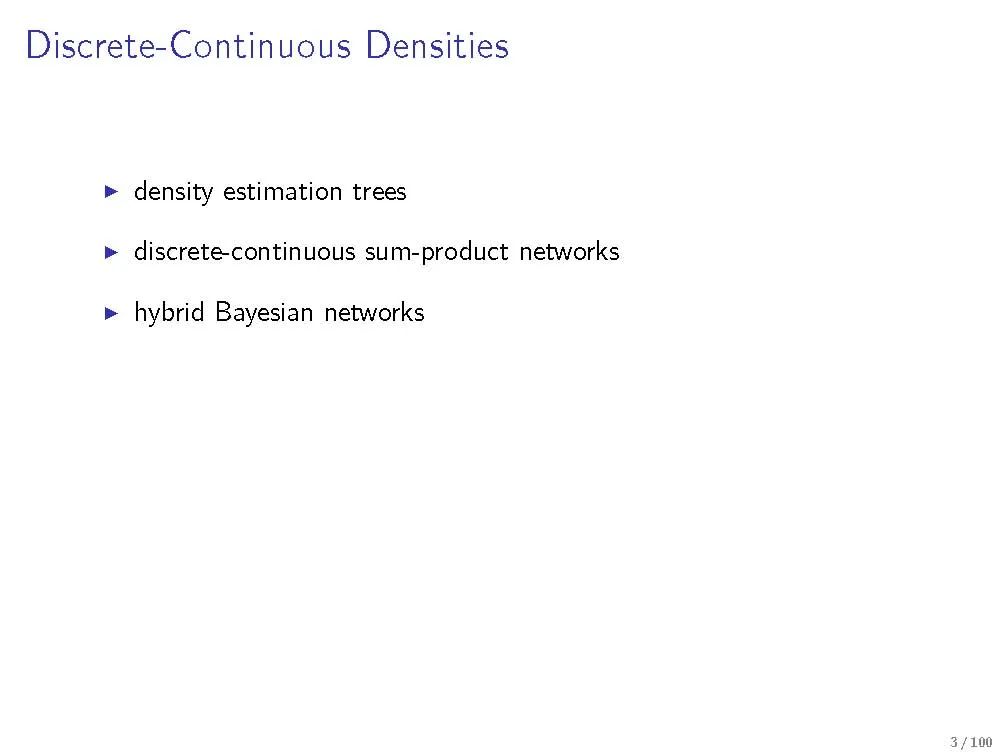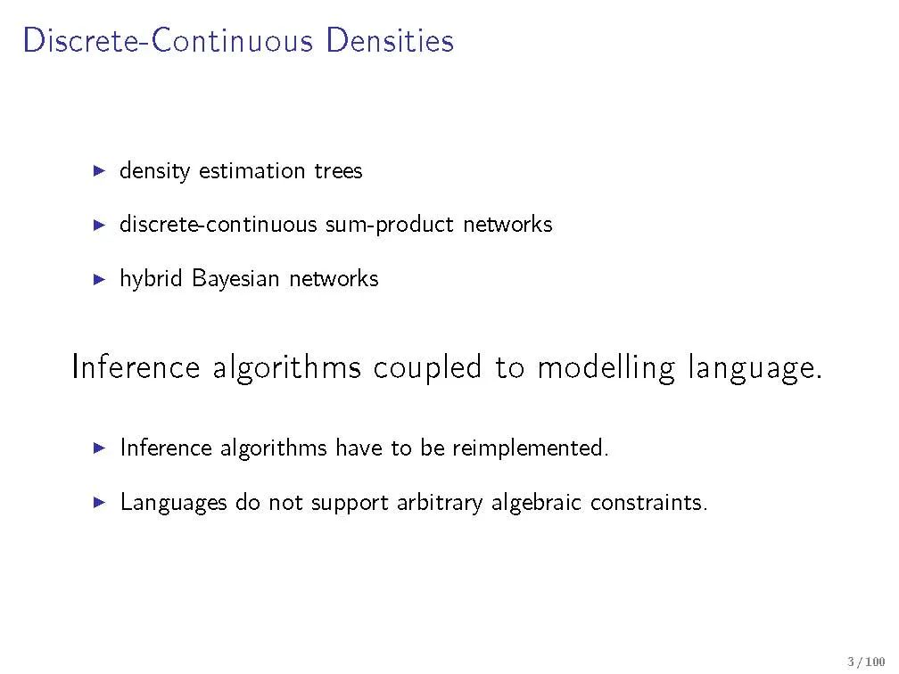 随着人工智能和机器学习在我们日常生活中的日益普及,迫切需要不仅智能而且安全、公平和可验证的系统。在现实世界中部署这样的系统通常等同于在表现出连续(定量)和离散(定性或逻辑)特征的领域中执行概率推理。这样的域通常被称为混合域。然后通过代数约束或逻辑约束对混合域进行约束,实现安全性和公平性。这进一步复杂化了执行概率推断的问题。此外,许多逻辑和代数约束可以来自环境本身,例如物理定律,或有助于描述系统的“正确”行为,例如必须满足的安全特性。在本教程中,我们介绍了加权模型集成(WMI),这是一个减少混合域概率推理的框架,以计算离散-连续逻辑公式的权重。因此,它是对已经广泛应用的加权模型计数(WMC)框架的一种推广。在教程的第一部分,我们逐步建立WMI的理论背景-一个旅程,我们开始从纯逻辑推理一路到混合领域的概率推理,同时提供涉及的挑战和连接到WMC的指针。其次,我们通过讨论WMI的应用,以及描述最具前景的开放工具和方法,提供了一个关于混合域概率推理问题的实用视角。