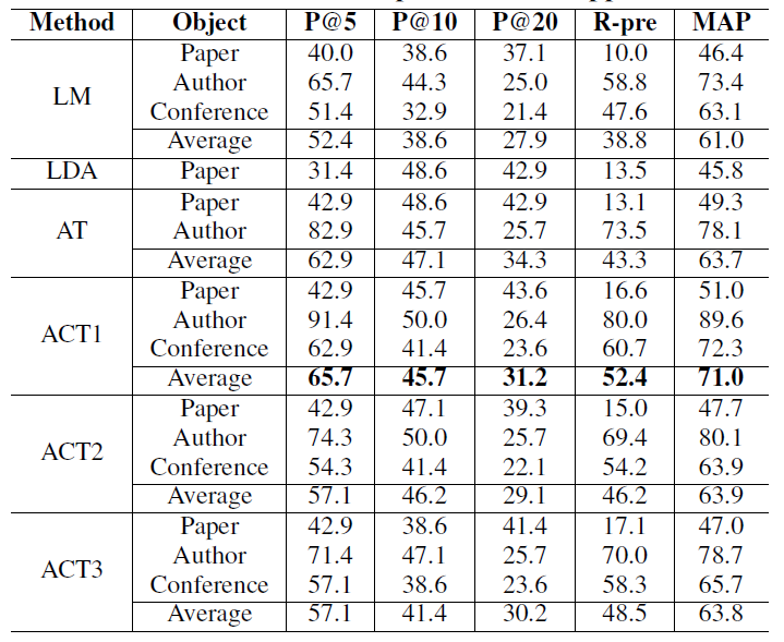 文章提出主题模型 ACT 对研究者异质信息网络统一进行建模,从中估计出不同类型的实体,包括研究者、会议、关键词以及论文在不同隐含话题上的概率分布。