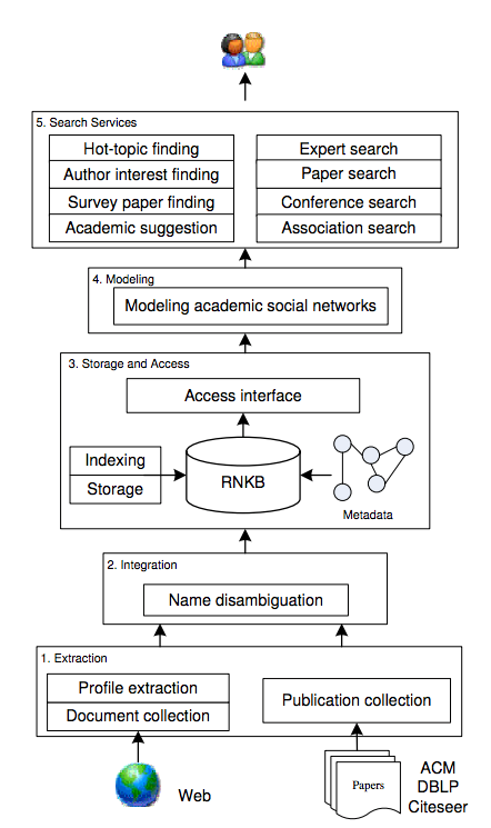 5)搜索服务(Search Services):基于建模结果,提供多种搜索服务,包括专家搜索、关联关系搜索、论文推荐以及引用推荐等。