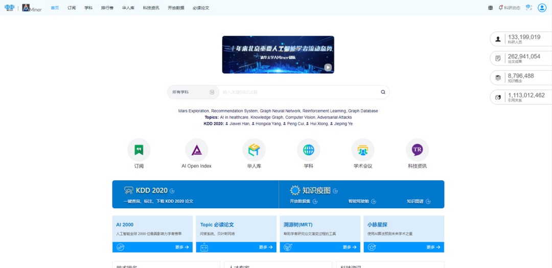 AMiner 平台自 2006 年上线以来,经过 10 余年的技术攻关,已经建成了智能型科技情报挖掘和知识服务系统,建立了超过 1 亿学者、4 亿论文和专利的科技情报智库,提供科技趋势分析、专家发现、智能指派、人才地图等科技情报智能服务。