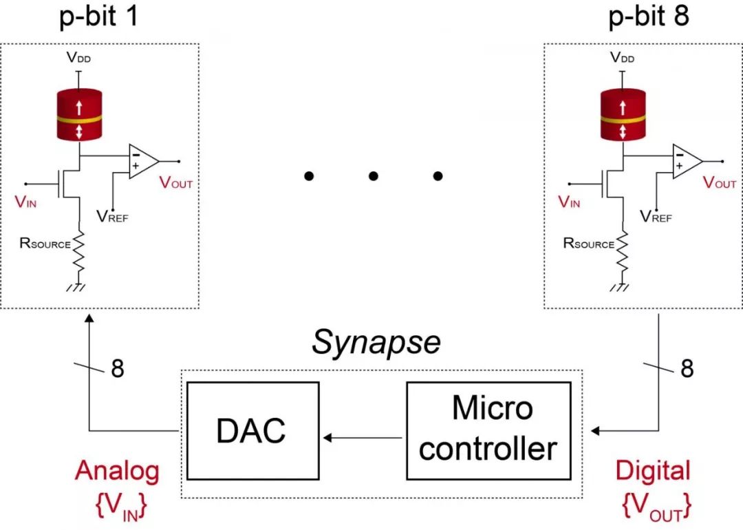 接下来,研究人员将三个传统的硅晶体管和一个微小的磁铁结合起来,创造出了所谓的p比特,其波动可以得到控制。这些磁铁厚度只有10个原子大小,在这个尺寸下,它们开始随机运动。该团队的一个关键进展是调整磁铁的厚度,以平衡热噪声的稳定性,并以可控的方式引入随机性。