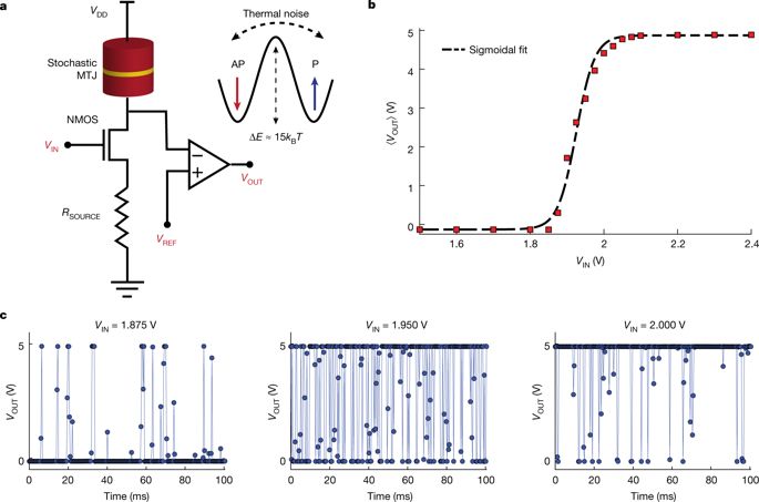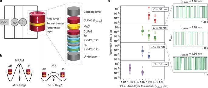 团队制造了一种改进版的磁阻随机存取存储器(MRAM),该技术利用磁铁的方向来创造0或1对应的电阻状态。研究人员对MRAM 器件作了修改,使其故意不稳定以更好地促进 p 比特波动的能力。