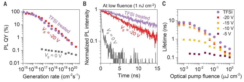 图4. A, 比较Vg = -20 V,Vg =0 V及TFSI处理过后二硫化钼的PL QY。B, 比较Vg =-20 V,Vg = 0 V及TFSI处理过后二硫化钼的发光衰减生命期。C, 发光衰减生命期与光强密度的关系。