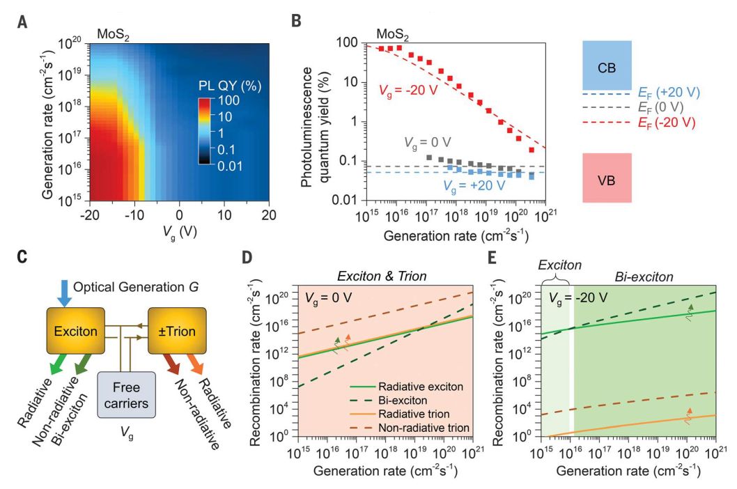 在过度金属硫属化物的单层材料中,准粒子之间的库伦作用力引发其强烈的交互作用,造成各种的准粒子复合模式。其中,光吸收造成的载流子形成激子,而激子(Exciton)的复合率和激子的浓度成非线性的关系。另一种准粒子,由一个自由电子和激子组成的带电激子(Trion),其浓度可以由材料中的背景带电粒子,即是由费米能阶所控制。要完整的解析材料光致发光(Photoluminescence; PL)的量子效率(Quantum Yield;QY),就必须要同时考虑载流子产生率及材料背景带电粒子的浓度的关系。
