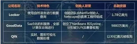 已经累计融资1.77亿美元的Looker令用户能够使用自然语言进行查询,降低了查询大型数据集的门槛;GoodData为企业提供大数据分析SaaS服务,其所有的数据分析服务实现了100%云化,企业可以将公司已有数据导入GoodData的云平台,再对数据做跟踪、切分、可视化、分析等处理。