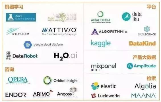 首先将企业大数据检索、产品大数据分析、大数据咨询预测、大数据平台和机器学习这五个领域的典型企业列举如下,接下来将分版块进行详细介绍。