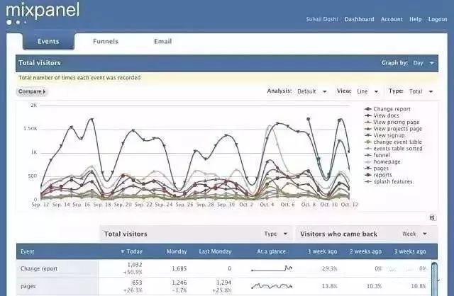 Mixpanel便是一家提供类似产品的公司,其让企业用户跟踪用户的使用习惯提供实时分析,其产品有用户动态分析(Trends)、行为漏斗模型(Funnels)、用户活跃度(Cohorts)及单用户行为分析(People)等几个模块,全面的覆盖了可能发生的用户行为与场景。
