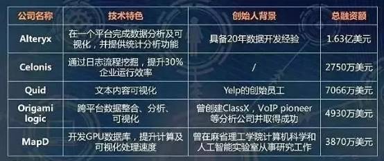 典型企业如Alteryx是一个提供一站式数据分析平台的初创公司,旨在让用户在同一个平台上完成数据输入、建模以及数据图形化等操作,将数据运算与精美的图像完美地嫁接在一起,并能够和SAS和R语言一样进行数据的统计和分析。