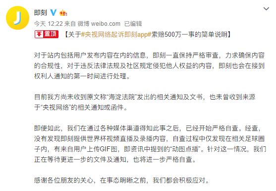 央视向即刻索赔500万,