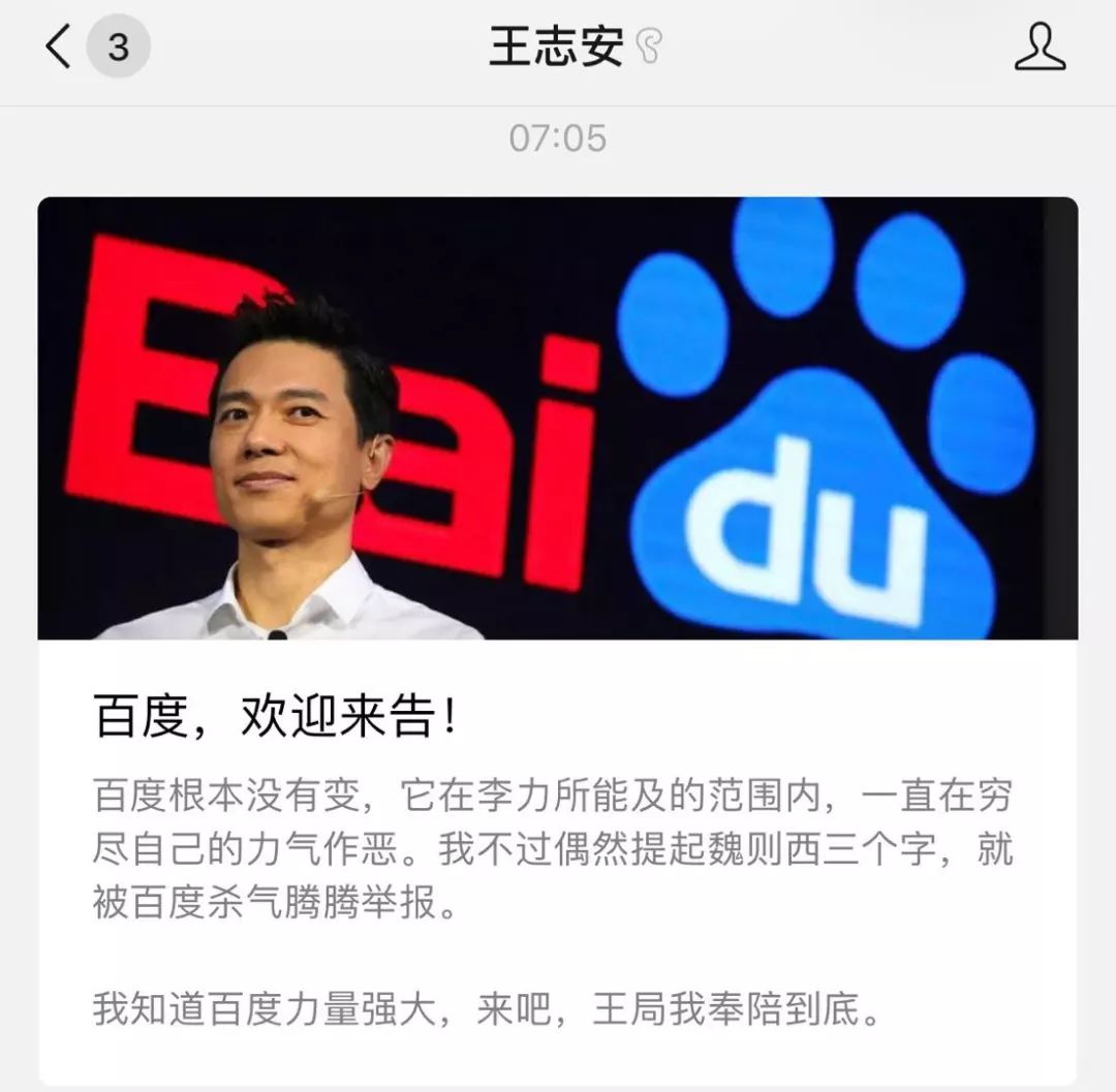 文中称,百度向王志安的公众号文章发起投诉,认为《权健该死,但不是只有它该死》一文对百度的品牌形象形成恶意诋毁,严重损害百度商誉及品牌声誉,百度将通过法律手段维护合法权益。