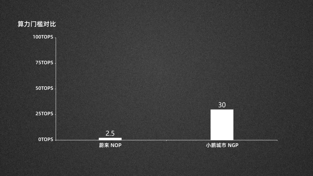 传感器一多,产生的数据量就更多,对计算能力的要求就升高了。我们统计了市面上实现高速辅助驾驶、和准备推出城市辅助驾驶的车辆,它们的算力水平。结果发现,要实现高速辅助驾驶,这个算力门槛是 2.5TOPS;而城市辅助驾驶的门槛是 30TOPS——实现城市辅助驾驶所需的算法模型、博弈策略,必须匹配更强的计算硬件。