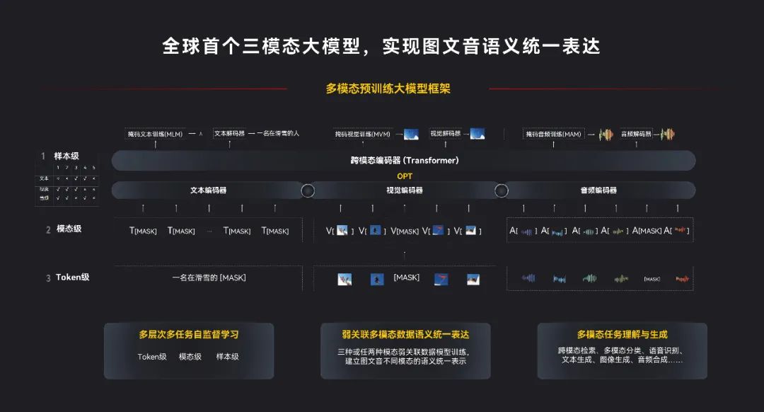 首先,这主要得益于非常强大的基础研究能力。通过多模态实现更加强大的人工智能一直是我们的梦想。从去年开始,在各研究团队单模态大模型取得阶段性成果的基础上,我们组织所内优势力量联合投入开始多模态攻关。第二,我们以中国自主的昇腾人工智能基础软硬件平台为基础,运用包括昇腾芯片和全场景人工智能计算框架MindSpore来打造多模态通用人工智能平台,通过对外交流合作大大加速了这个过程。目前平台具备了三大关键技术(多模态理解与生成的多任务统一建模、面向国产化软硬件的高效训练与部署、多模态预训练模型架构设计与优化),和六项核心能力(多模态统一表示与语义关联、跨模态内容转化与生成、预训练模型网络架构设计、标注受限自监督模型学习、模型适配与分布式训练、模型轻量化与推理加速)。