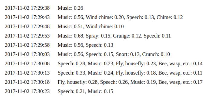 运行 python capture.py 开始从麦克风中无限制地采集数据。默认配置下,它会每 5-7s 将数据输入到神经网络。可以在其中看到之前例子的结果。