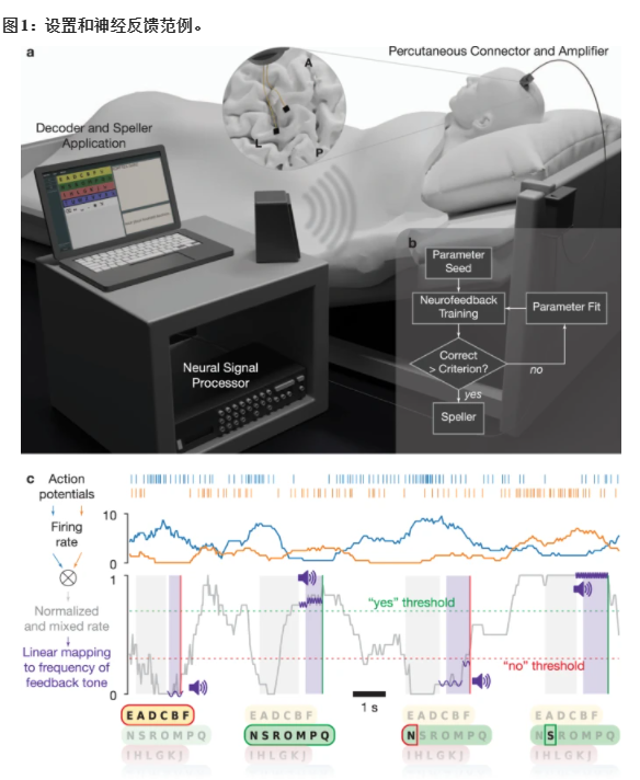 当患者无法移动时,这种植入设备能够读取患者的大脑信号并记录其移动冲动。这些大脑信号被实时发送给计算机,计算机学会将这些运动尝试分类为「是」或「否」的响应,使得患者能够回答其他人询问的问题。此外,这套设备还可向患者大声朗读字母,患者可以对每个字母回答「是」或「否」以拼写出单词。