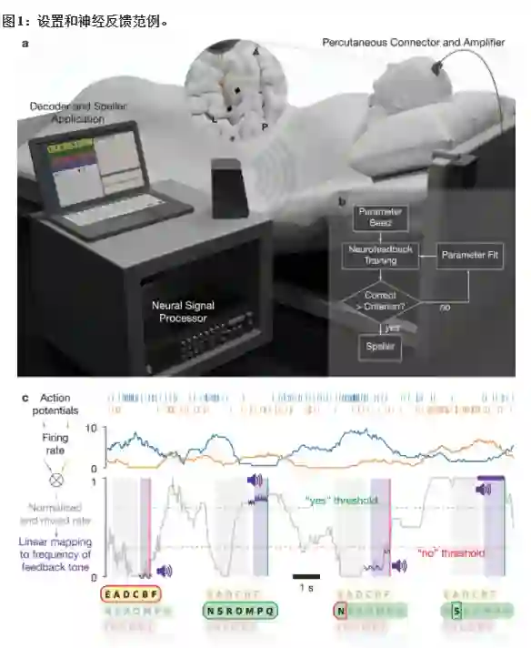 参与者在实验开始后第 86 天第一次尝试调节音调,随后在第 98 天成功调节神经信号发射率,并首次将反馈频率与目标匹配。采用神经反馈策略,从第 106 天起,参与者能够调节神经激活率(firing rate),并且能够使用这种方法来选择和拼写字母。