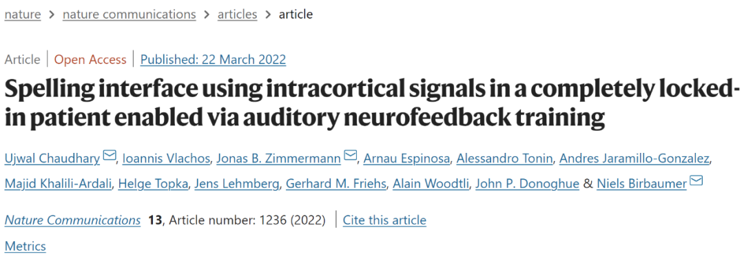 从 2018 年开始,来自图宾根大学的研究团队开始与一位患有渐冻症(肌萎缩侧索硬化症,ALS)的参与者合作,借助脑部植入技术让参与者实现了与家人沟通。