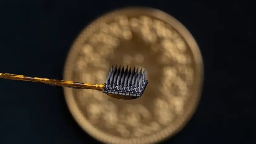 该研究通过手术将两个 3.2 毫米宽的方形「皮质内微电极阵列」植入负责运动的大脑皮层,即运动皮层。每个微电极阵列上带有数十根用于记录神经信号的微针,然后电线将信号馈送到一个与患者颅骨相连的连接器上。在外部,连接器上设有放大器,能够将信息数字化并将其发送到计算机。