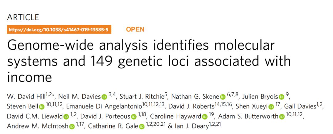 杂志上发表了题为:Genome-wide analysis identifies molecular systems and 149 genetic loci associated with income(全基因组分析确定了与收入相关的分子系统和149个遗传位点)的研究论文。