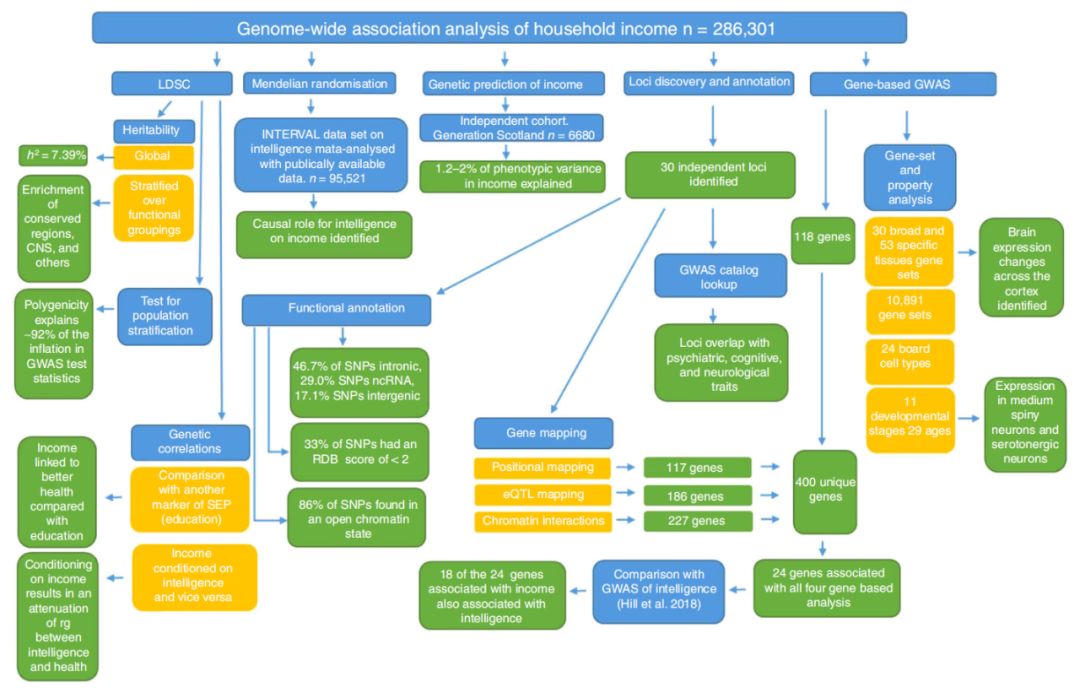 在本论文中,研究者使用英国生物银行的数据集来检查当代英国样本中家庭收入的基因关联性(n = 286301)。研究人员确定了30个独立的全基因组显著位点,其中29个在以前的工作中未见报道。研究者使用一种利用遗传相关性状的遗传力的方法,对GWAS(MTAG)进行多性状分析,发现另外120个基因座与收入相关。