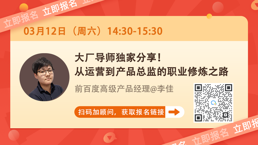 3月12日(周六)下午14:30,原百度高级产品经理、原老饭骨产品总监@李佳,1小时为你独家分享:从运营到产品总监的职业修炼之路!