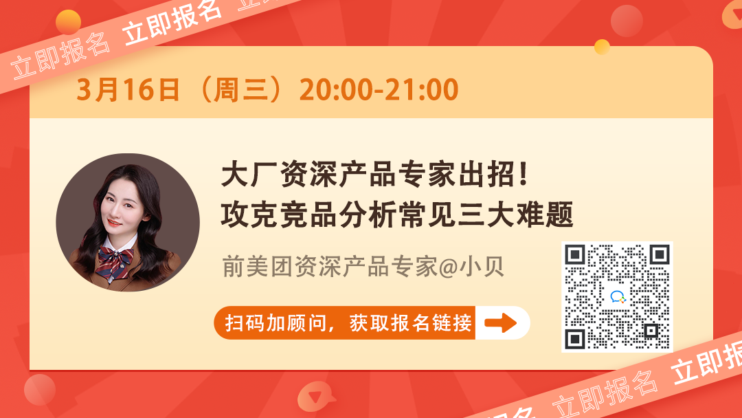 周三晚8点,大厂资深产品专家出招!攻克竞品分析常见三大难题,免费名额仅限50人哟~