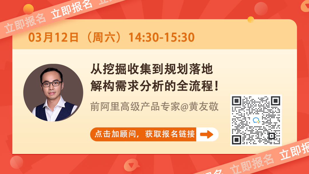 3月12日(周六)下午14:30,前阿里高级产品专家@黄友敬老师帮你梳理从挖掘收集到规划落地,解构需求分析的全流程!教你认清需求分析的常见误区,拆解需求分析的正确姿势!
