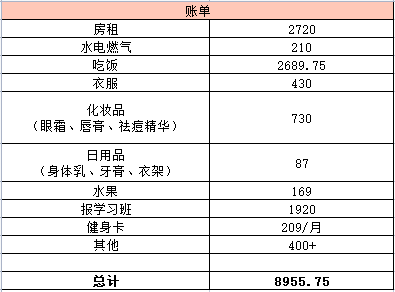 跟她沟通时,我帮她估算了一下每个月开销,大概可以压在7000内,结果她直接甩给我上个月的账单— —