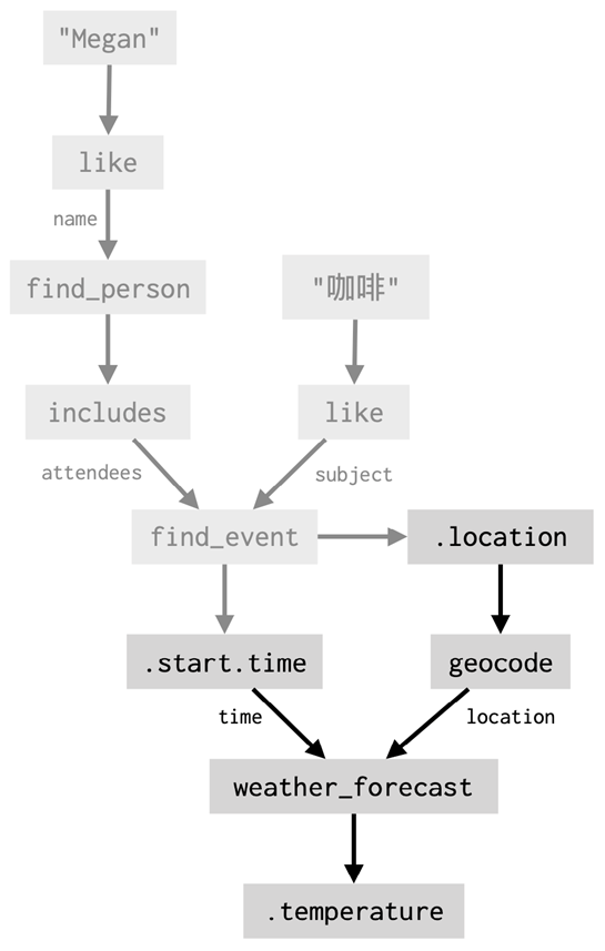 但如何处理更复杂的请求呢?例如“约 Megan 喝咖啡的时候气温如何?”,要回答这个问题,智能助理需要做一系列事情:首先要找出 Megan 是谁,并在日历应用程序中查找包含 Megan 的事件,然后确定其开始时间,并查询该时间的天气服务。为解决这个问题,科研人员不希望添加一个叫做 “和某人在一起期间的天气”的意图,而是希望把自然语言转换为联系所有这些步骤的程序。该程序被表示为数据流图(dataflow graph),它明确定义了智能助理要执行的程序中的步骤(节点)和它们之间的数据依赖关系(边):