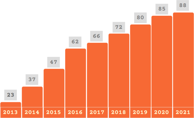 2013 至 2021 年期间,Sci-Hub 数据库的年增长趋势。